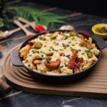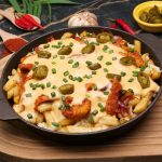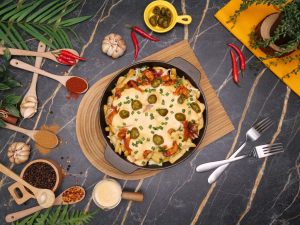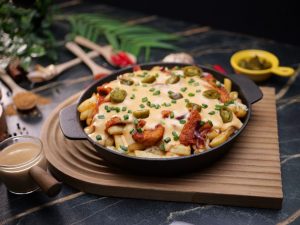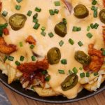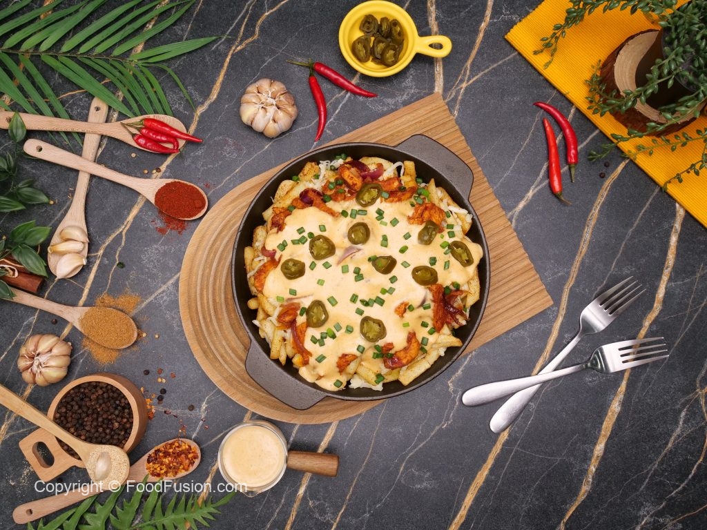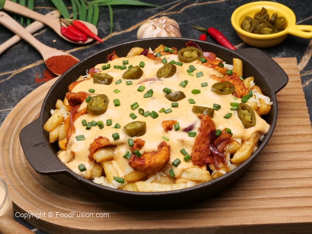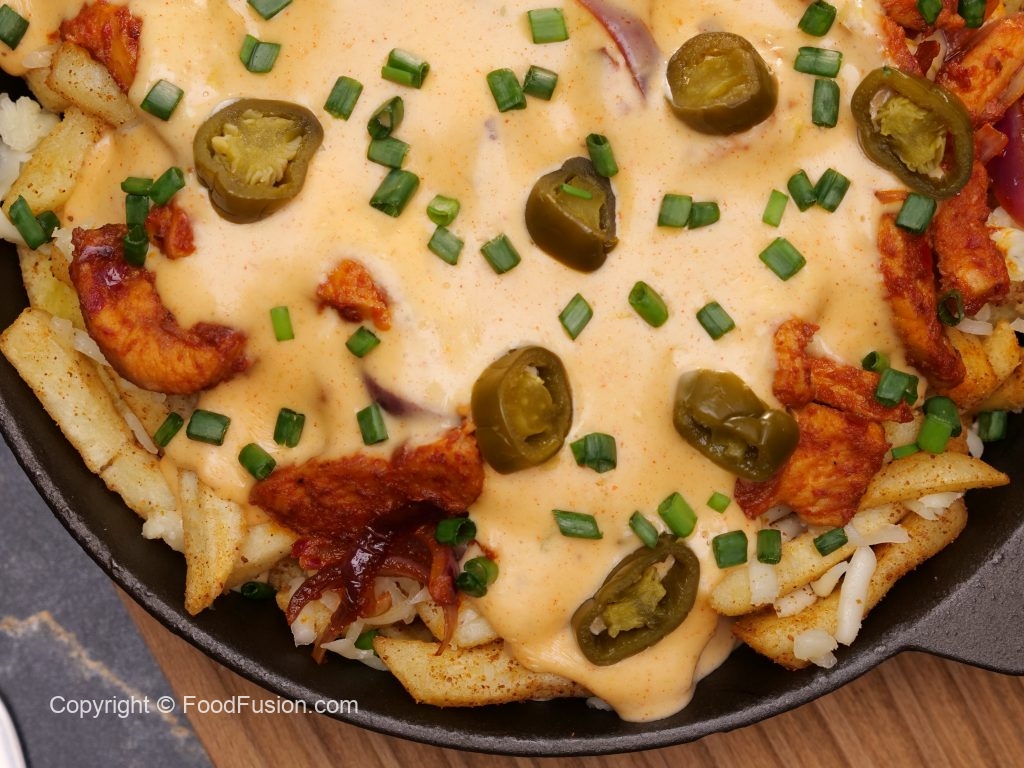 On cast iron pan,add seasoned potato fries,mozzarella cheese,prepared spicy hot chicken,prepared chilli cheese sauce,pickled jalapenos,spring onion & serve!