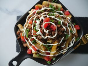 In serving dish,add fries,cheddar cheese,cooked mince,tomato,green onion leaves,sour cream & serve!