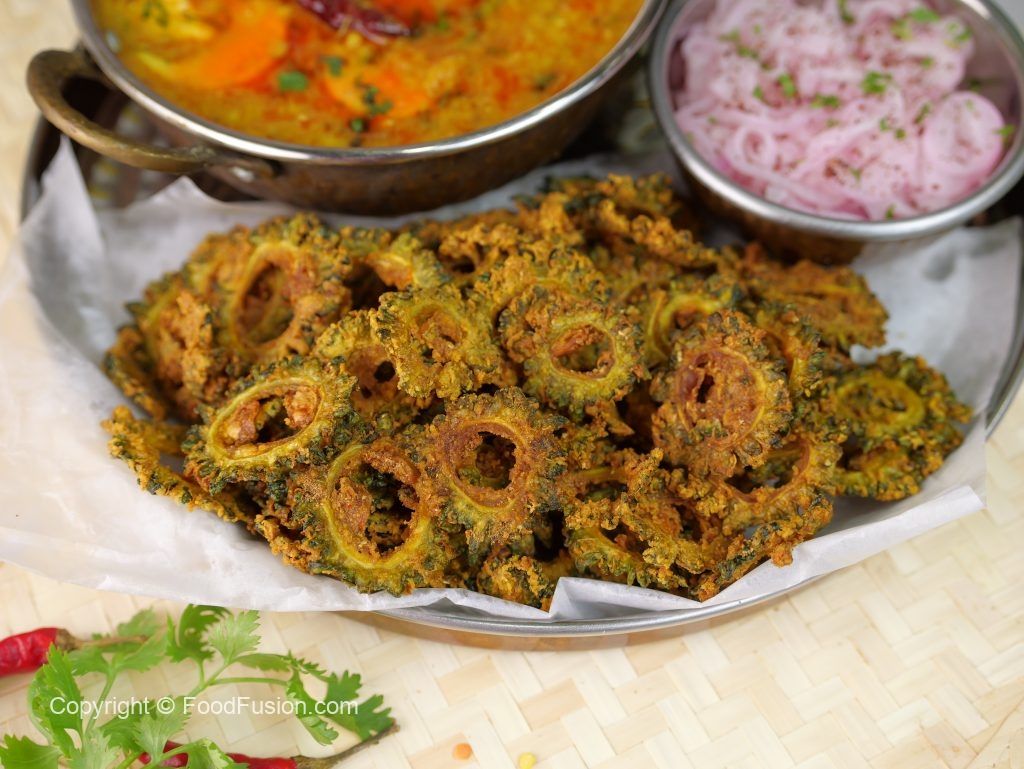 -In a bowl,add bitter gourd,pink salt & mix well,cover & let it rest for 10 minutes then rinse with water & strain.