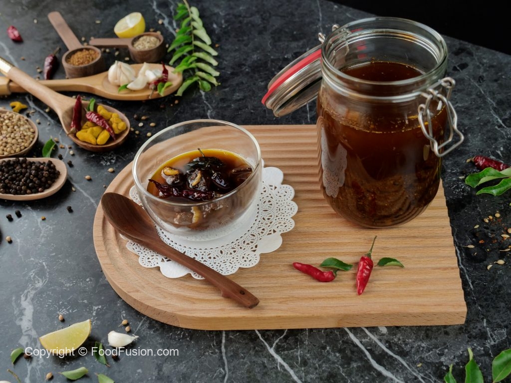 In remining oil,add fenugreek seeds,cumin seeds,fennel seeds,mustard seeds,yellow mustard seeds, black peppercorns,nigella seeds,garlic,dried red chillies,curry leaves,mix well and cook on medium flame for 2 minutes.