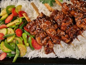-Sprinkle sesame seeds & serve grilled teriyaki chicken with boiled rice & sautéed vegetables.