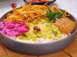 -In a small bowl,add yogurt,olive oil,lemon juice,black pepper crushed,pink salt,mustard paste,honey, fresh coriander,mix well & set aside.