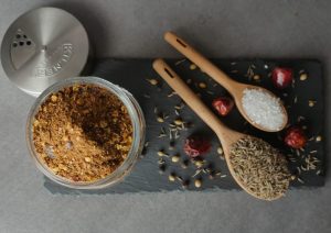 In spice mixer,add roasted spices,citric acid,salt,dried mango powder,black salt and blend to make a fine powder and take out in a bowl.