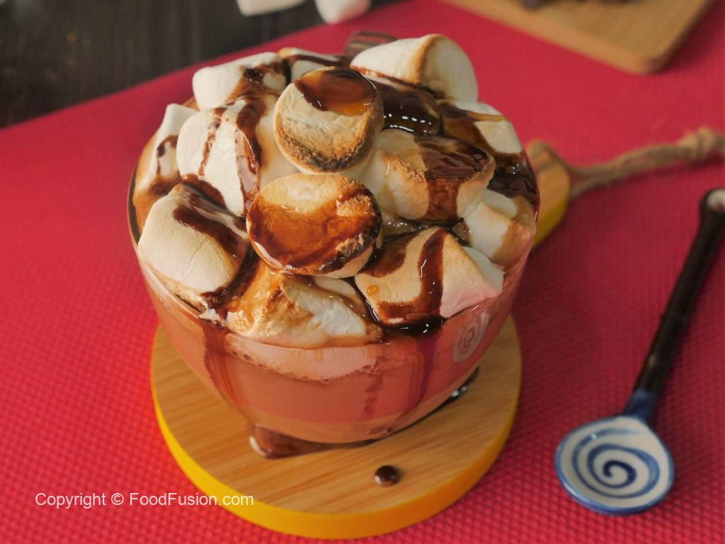 In serving cup,add caramel hot chocolate,marshmallows and burnt with blow torch.