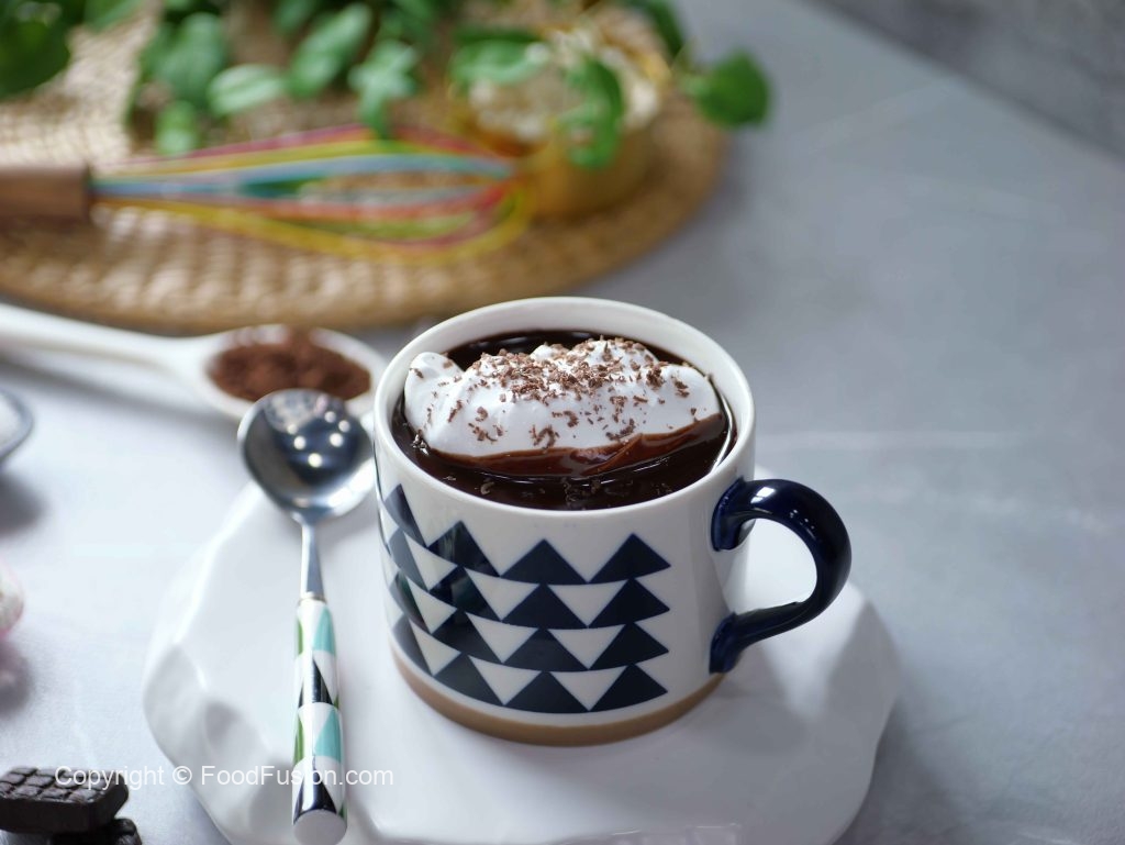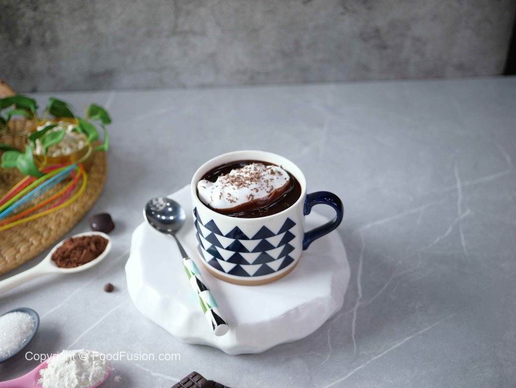-Take out from oven,pour prepared hot chocolate,add whipped cream & garnish with grated dark chocolate & serve!