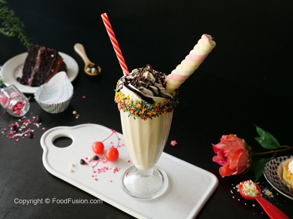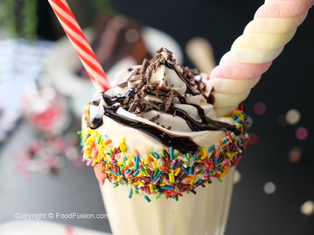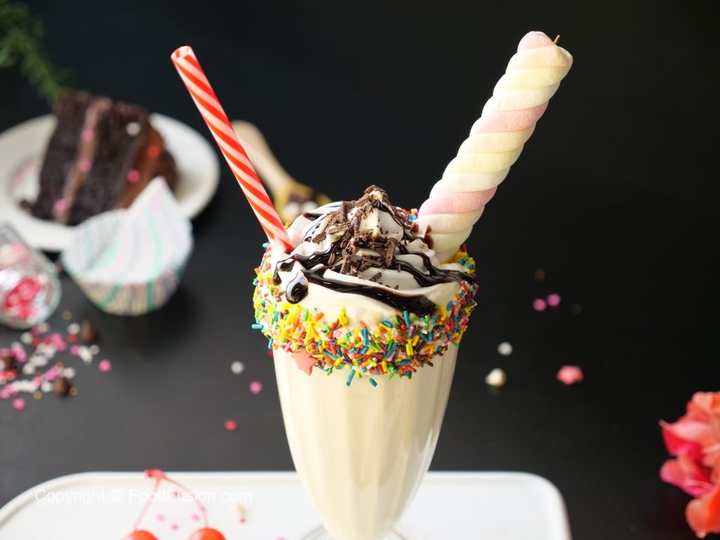 -Serving glass ko whipped cream mein dip karein aur colored sprinkles sa coat ker lein.