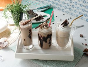 In a serving glass,add ice cubes,prepared tres leches iced coffee,top with whipped cream and garnish with chocolate & serve!