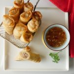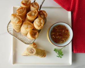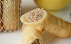-Take samosa sheet/manda patti 5 x 5”,add mince filling,fold over the sides,roll up and apply all-purpose flour paste.