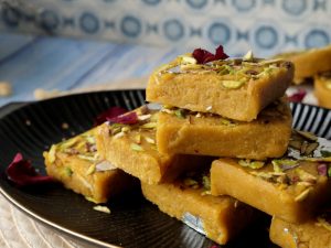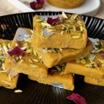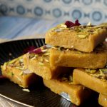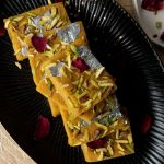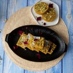 Garnish with edible silver leaves,sprinkle pistachios & press gently.