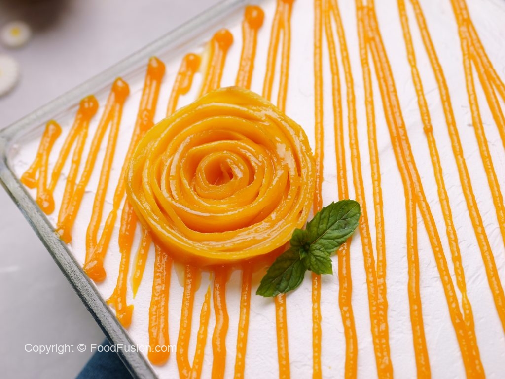 -Poke holes with the help of fork or skewer,pour prepared mango milk syrup & let it absorb completely (add more syrup if required).