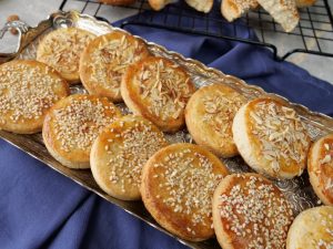-Place tikiyan on greased baking tray,apply egg with the help of brush,sprinkle almonds & sesame seeds.