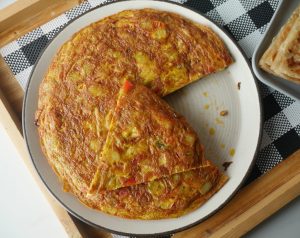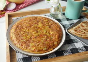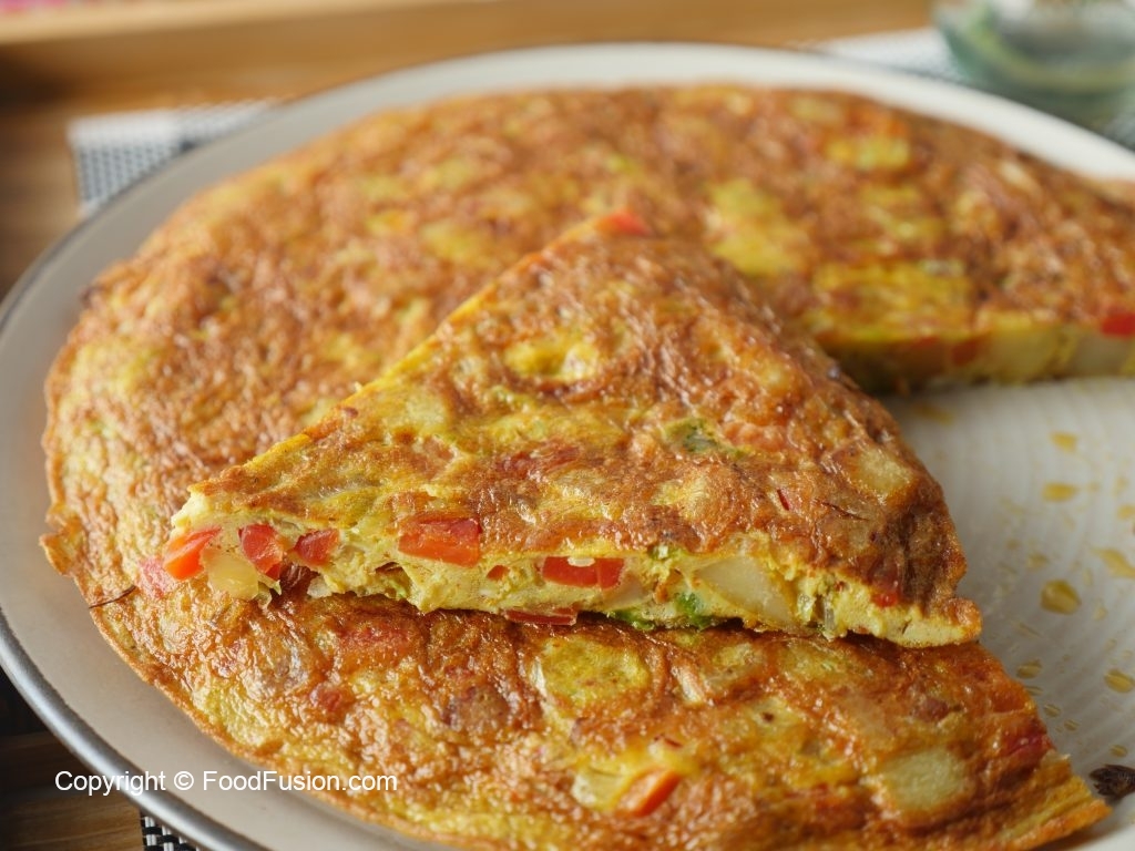 In frying pan,add cooking oil,egg omelet mixture and spread evenly,cover and cook on low flame for 5-6 minutes then flip and cook for 2-3 minutes & serve!