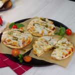 -Turn off the flame,on cooked naan,add & spread pizza sauce,add cooked chicken,prepared alfredo sauce,cheddar cheese,mozzarella cheese,pickled jalapenos,sprinkle red chilli crushed & dried oregano,cover,turn on the flame & cook on low flame until cheese melts (3-4 minutes).