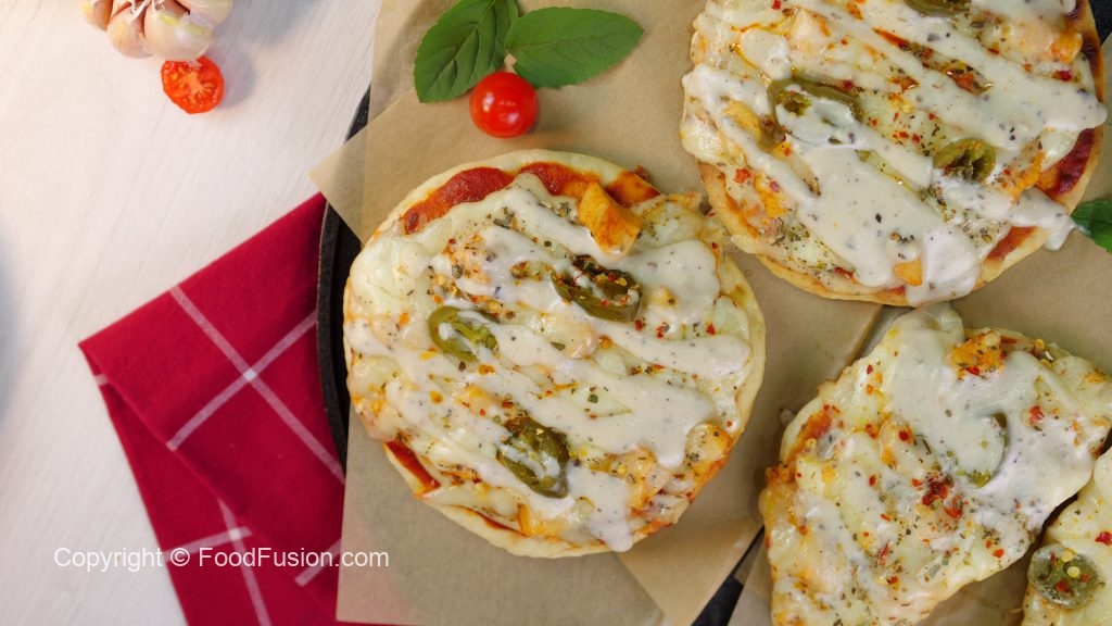 -Chulha bund ker dein,cooked naan per pizza sauce dal ker pheela lein,cooked chicken,tayyar alfredo sauce,cheddar cheese,mozzarella cheese,pickled jalapenos,lal mirch crushed & dried oregano dal ker dhak dein,chulha on karein aur halki ancch per cheese melt ho janay tak paka lein (3-4 minutes).