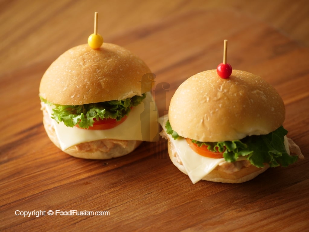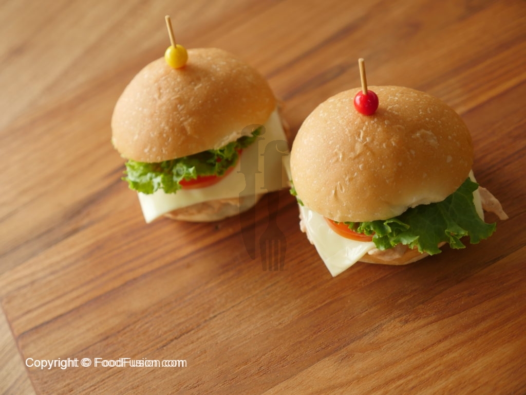 Mini burger bun per chicken mixture dal dein,cheese slice & tamatar slice,lettuce leaf rakh ker upper sa dusra bun rakh dein.