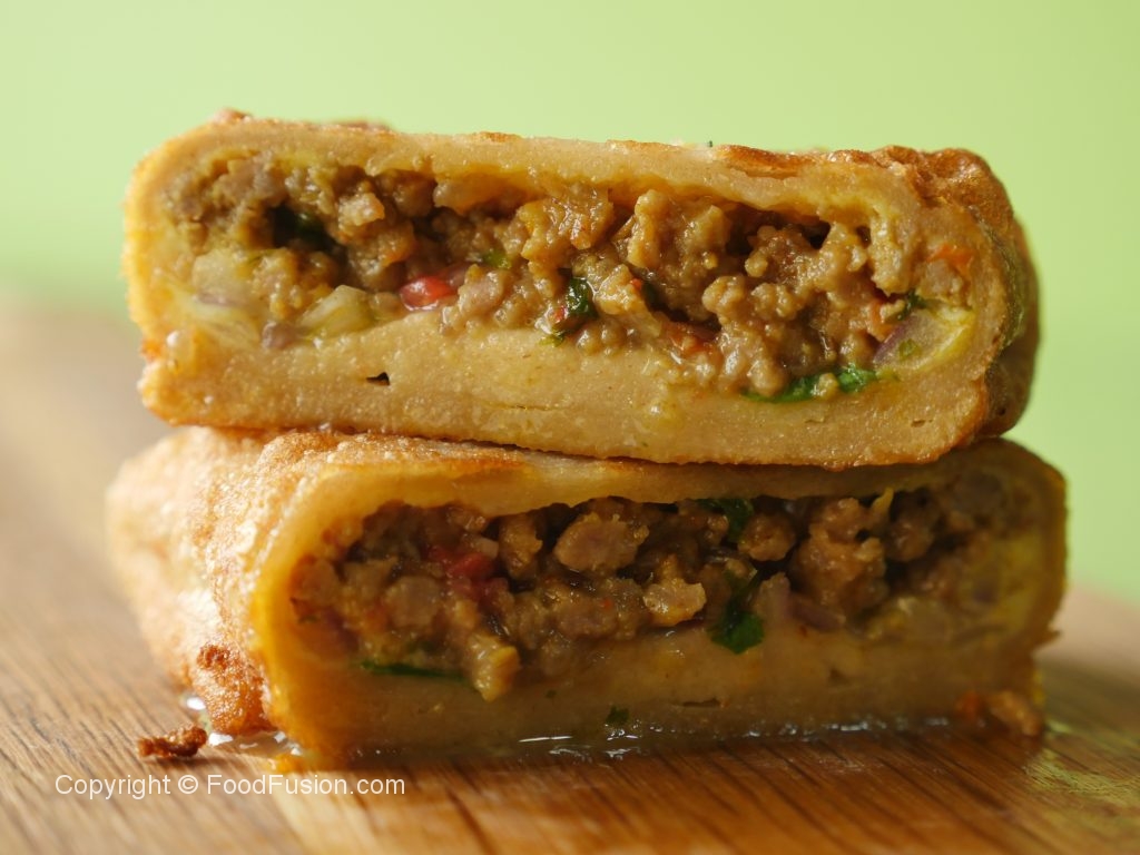 Add cooked mince,egg mixture and fold all edges of rolled dough and apply egg to seal the edges (makes 4-5).