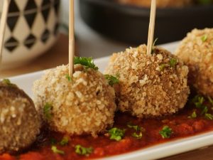 Serve mozzarella balls with marinara sauce & garnish with fresh parsley.