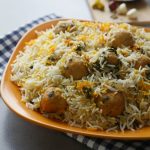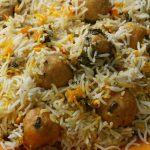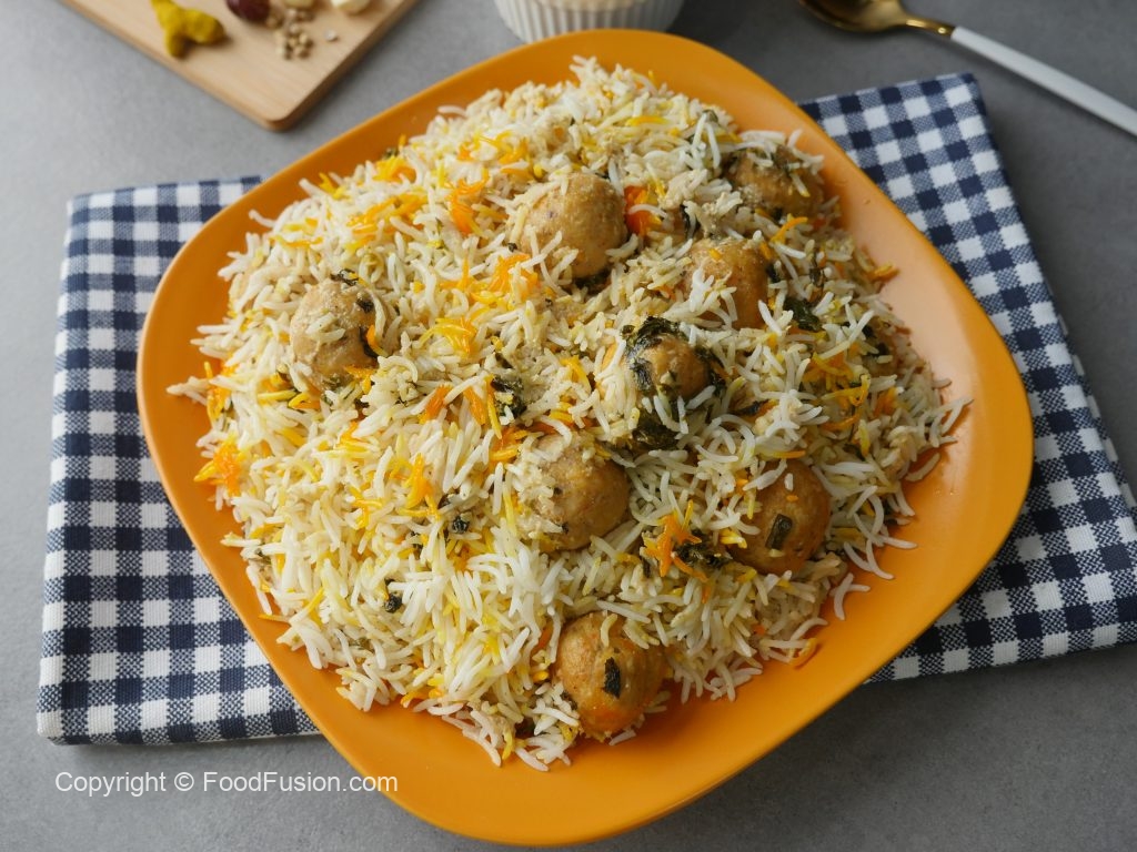 In pot,add half quantity of boiled rice,meat balls with gravy,mint leaves,fresh coriander and remaining quantity of boiled rice.