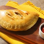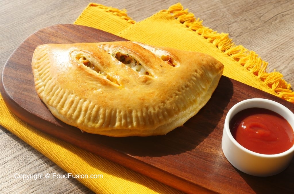 On half side of the dough, add and spread pizza sauce, cheddar cheese, chicken vegetable filling, mozzarella cheese, red chili crushed & dried parsley.