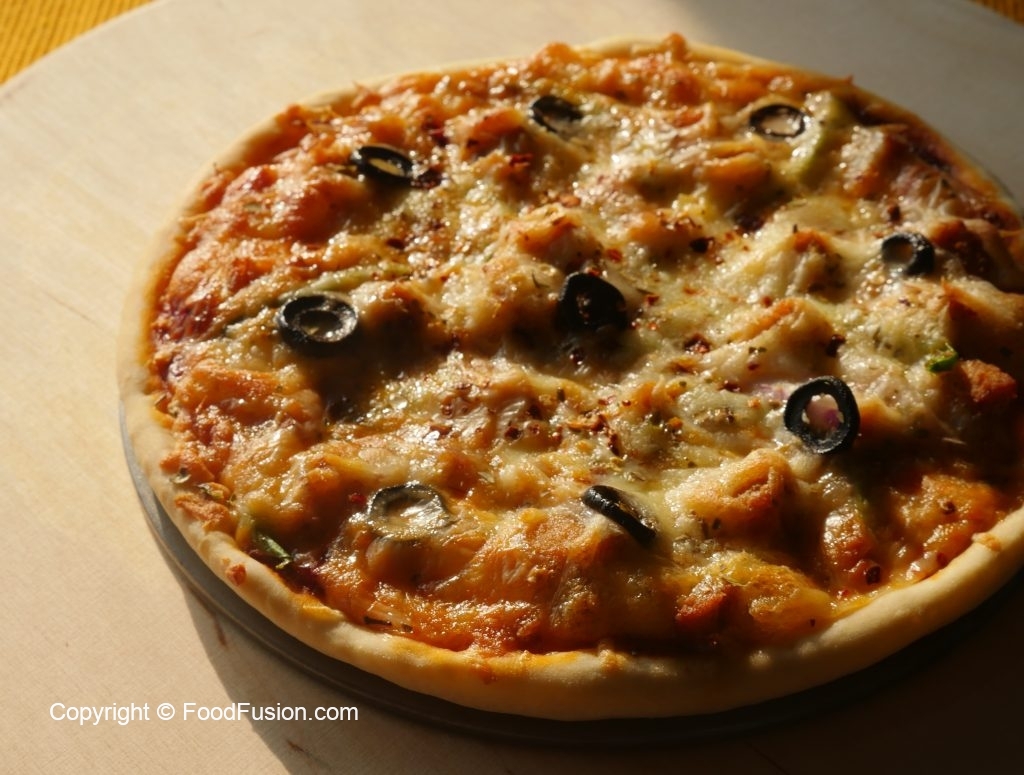 Add and spread pizza sauce, cheddar cheese, chicken chunks, capsicum, onion, red chilli crushed, mozzarella cheese, olives & dried oregano. (makes 1 small size pizza)