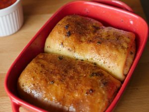 Apply garlic butter with brush & bake in preheat oven at 180 C for 15 minutes.
