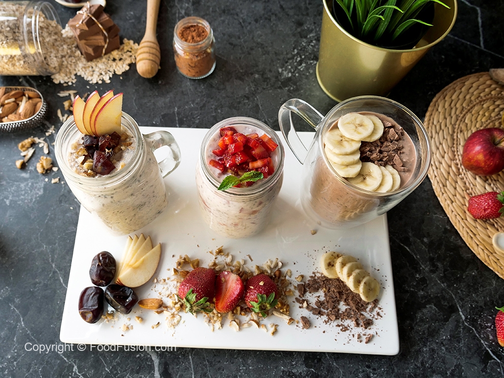 Glass mein instant oats,chai seeds,dahi,khajoor,mixed nuts,saib,darchini powder aur doodh dal ker ache tarhan mix karein aur dhak ker 6 hours ya overnight kliya refrigerator mein rakh dein.