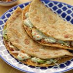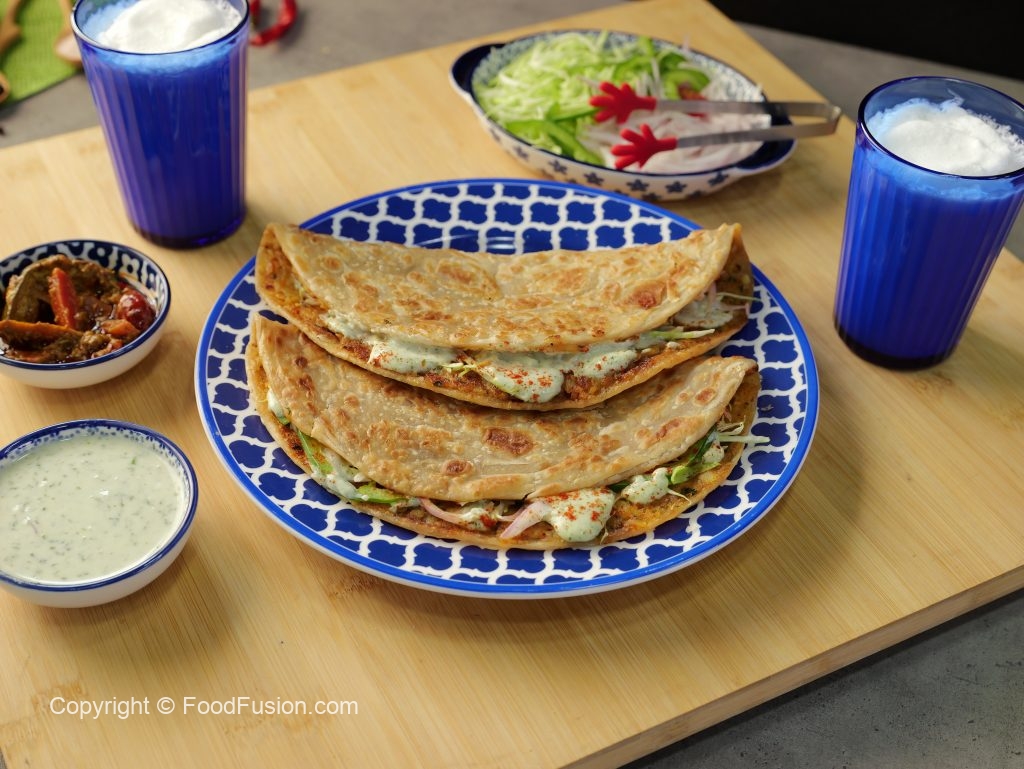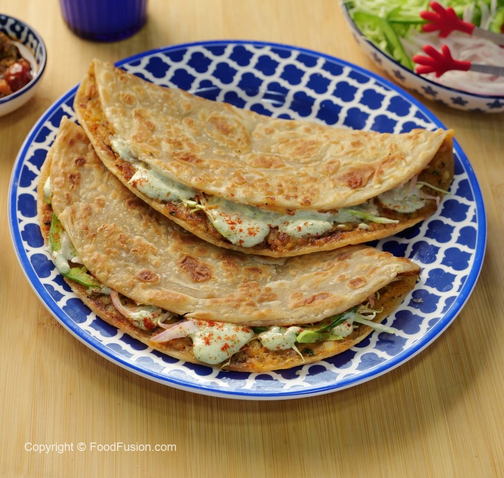 -Flip & on half side of paratha,add & spread cabbage,vinegar-soaked onion,capsicum,mint yogurt sauce,paprika powder,flip the other side of the paratha (makes 4-5) & serve!