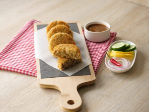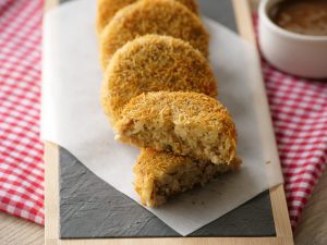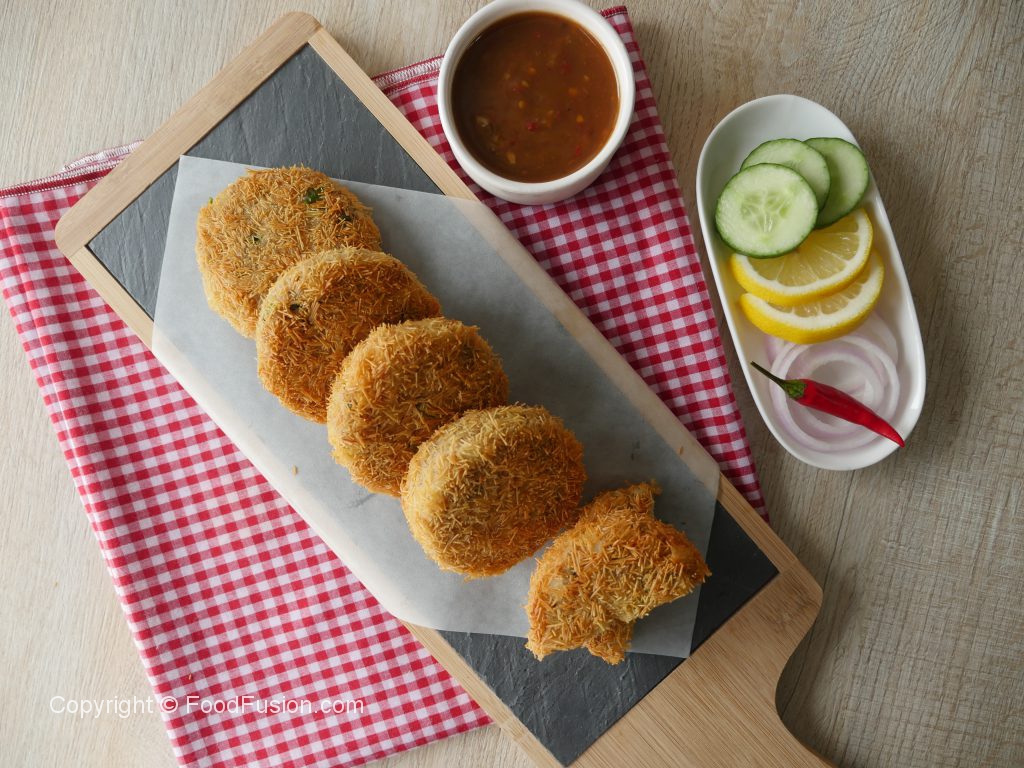 Dip kabab into beaten eggs then coat in crushed vermicelli (makes 8-10).
