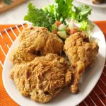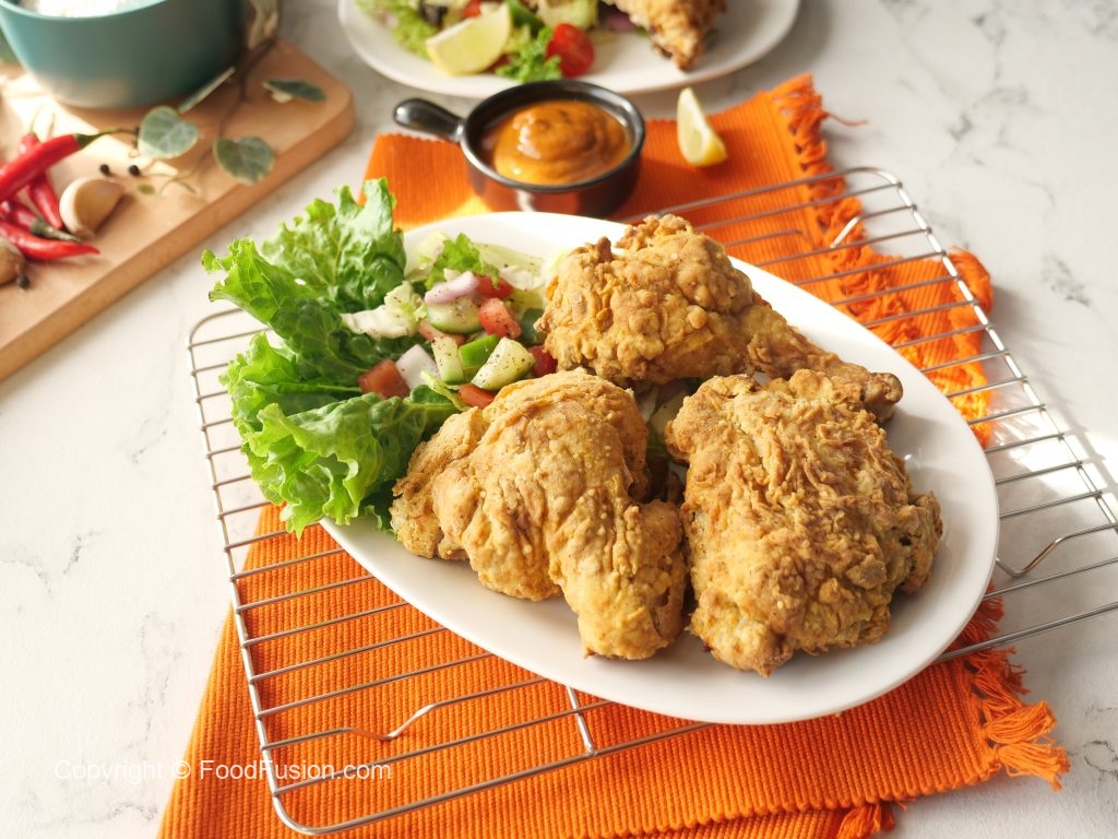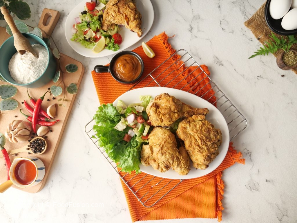Crispy air fried chicken ko sauce & salad ka sath serve karen.