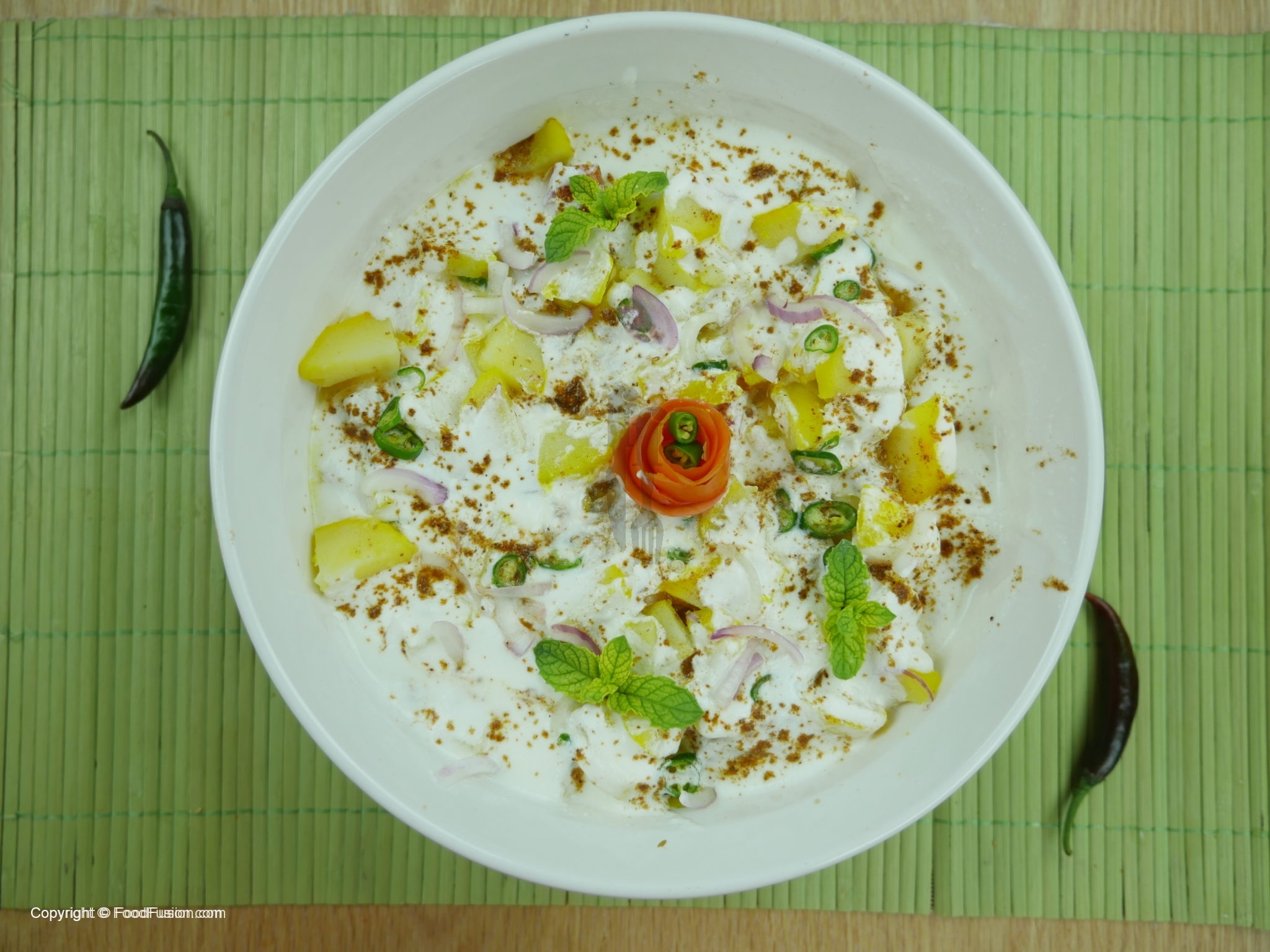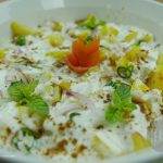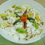 Beat yogurt. Add a layer of potatoes than add yogurt layer on chickpeas. Add green chili. Garnish with chaat masala and serve.