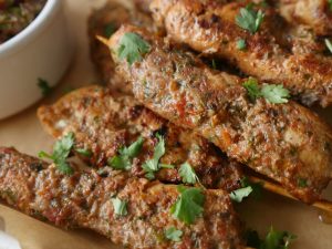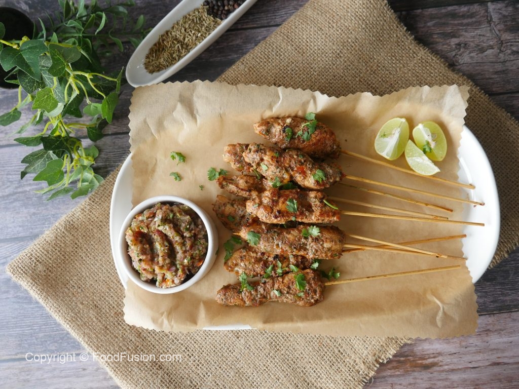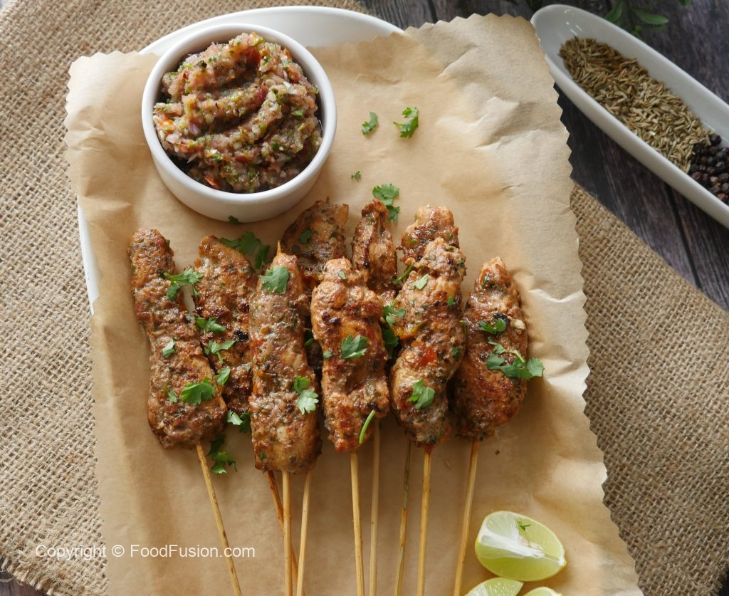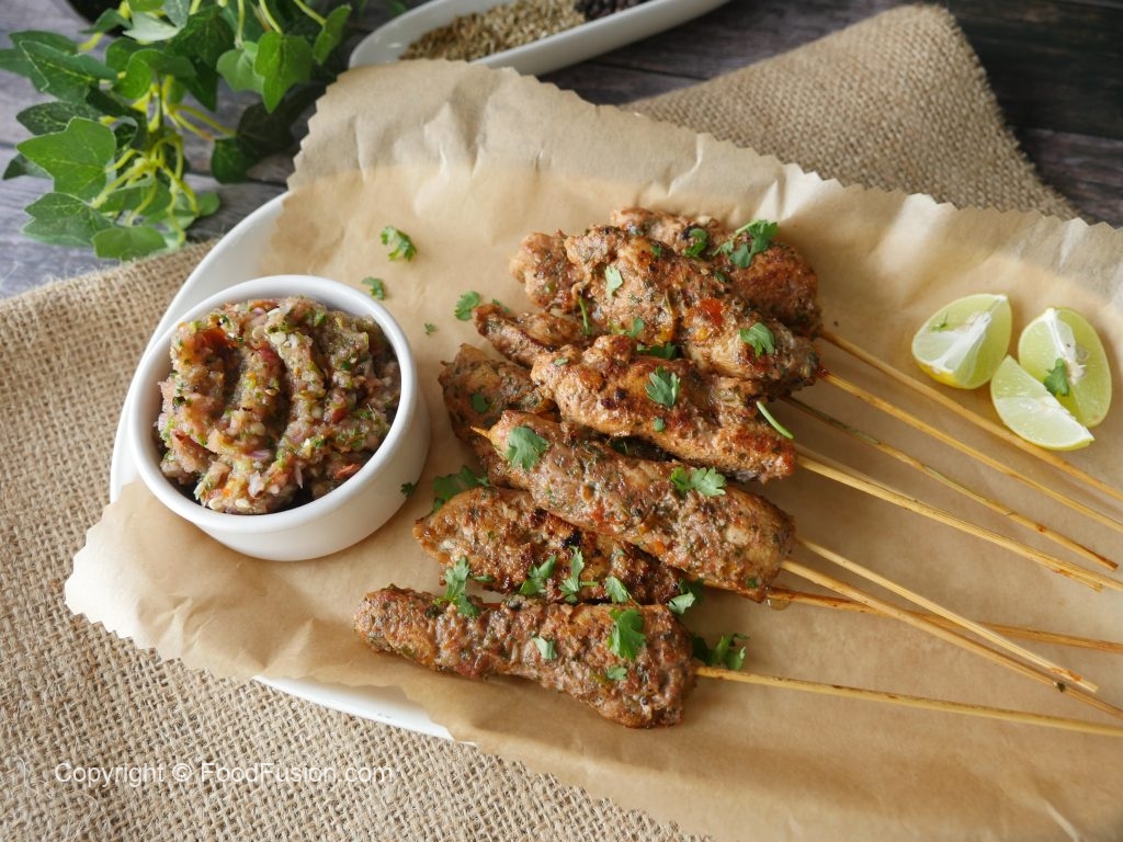 In frying pan,add cooking oil and fry chicken skewers on low flame from all sides until done.