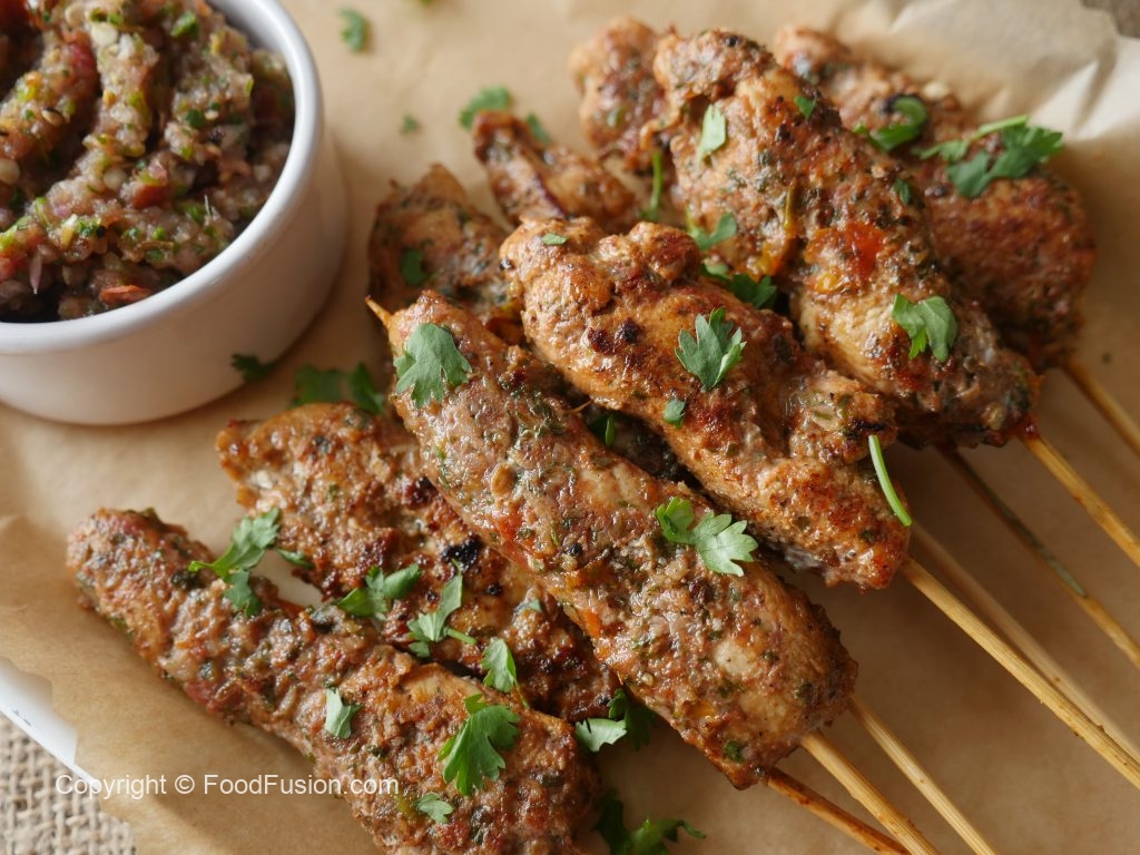 Thread chicken strips into skewers and apply grinded tomato mixture on chicken skewers & reserve half grinded tomato mixture for serving.