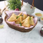 -Apply flour slurry,make a pocket,add mince filling in the centre & roll into the shape of samosa and seal corners with all-purpose flour slurry (makes 12-14).
