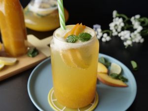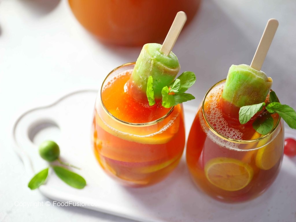 -Ab ek jug mein ice cubes, prepared lemonade, peach, red grapes, apple, lemon, orange juice, pineapple juice, sparkling water aur omore traffic light daal kar mix karen.