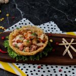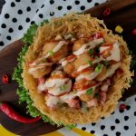 On potato nest,add vegetable filling,chicken cheese balls,drizzle prepared cheese sauce,tomato ketchup and garnish with green onion leaves & serve!