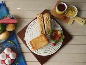 Desired slices mein cut karein,tomato ketchup & mayo mustard sauce ka saath serve karein!