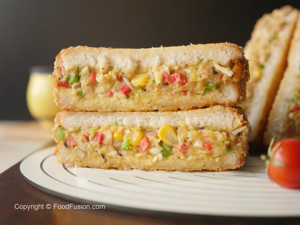 Bread slices per tayyar mixture ball rakh ker evenly pheela lein aur upper sa ek aur bread slice rakh dein phir tayyar flour slurry mein dip karein aur breadcrumbs mein coat ker lein & sandwich ko properly shape ker lein (makes 7-8).