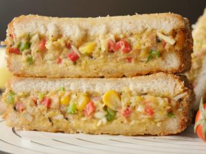 Pyaz,shimla mirch,gajar,corn kernels,chicken sausages,fresh parsley,namak,kali mirch crushed,zeera, lehsan powder,chicken powder,paprika powder,kalay til,safed til aur mayonnaise dal ker ache tarhan mix ker lein.
