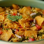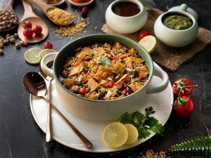 In a serving dish,add ragha chaat,onion,tomato,green chilli,spicy green chutney,tamarind sauce,sev nimco,papri,fresh coriander,chaat masala & serve!