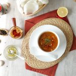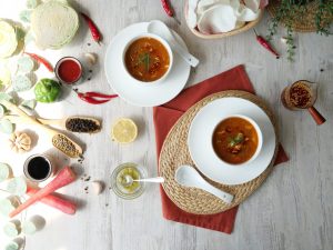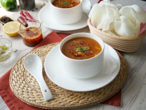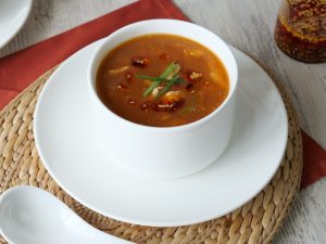 -In a serving bowl,add hot & sour soup & garnish with spring onion leaves,chilli oil & serve!