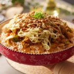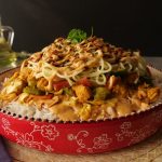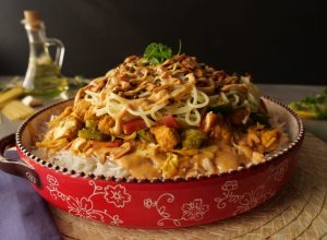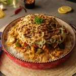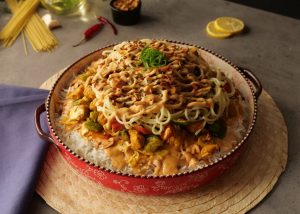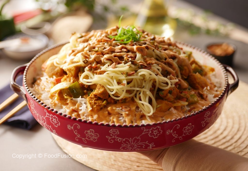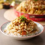 In a serving dish, add boiled rice & drizzle prepared sauce over it. Add prepared chicken with vegetables, boiled spaghettis, fried garlic & green chillies, prepared sauce, garnish with spring onion green & serve!