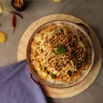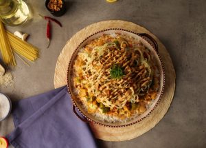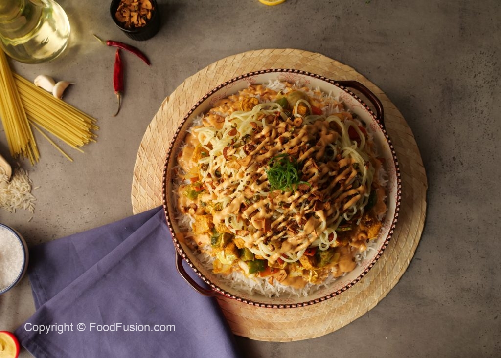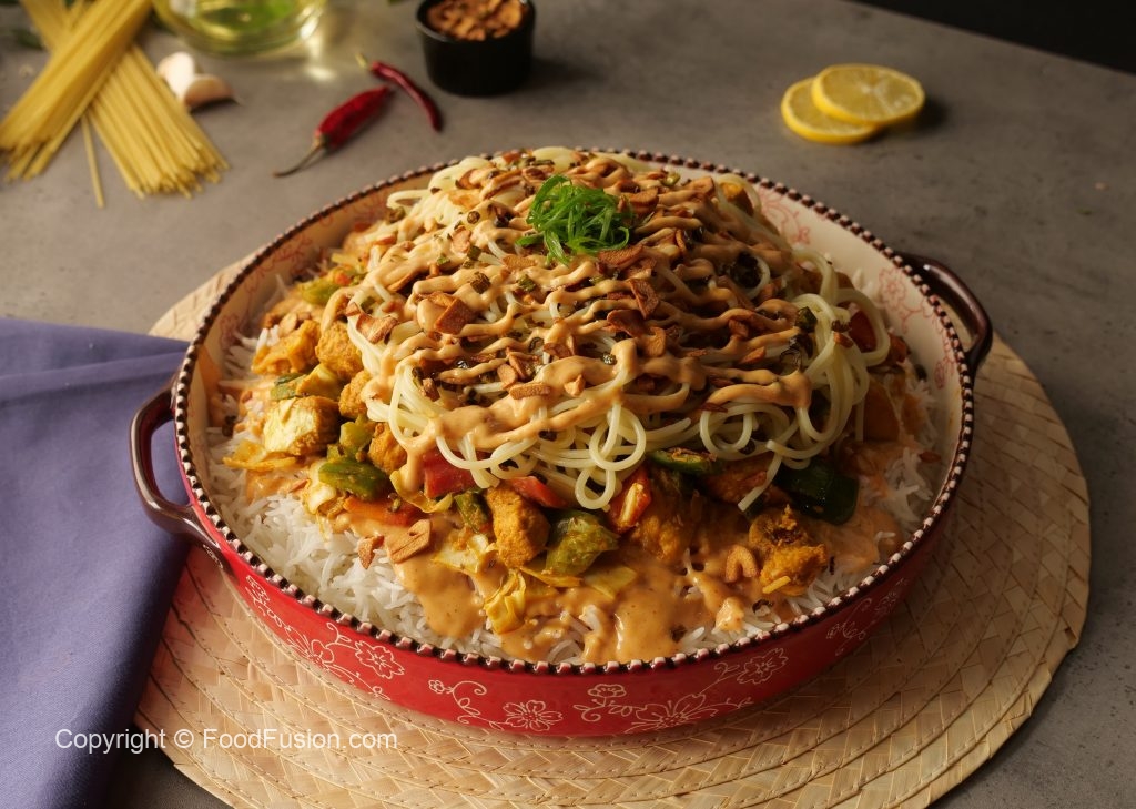 Serving dish may boil kiye huye chawal phela den. Ab tayar kia hua sauce daal kar, tayar ki hui chicken & vegetables, boiled spaghettis, fried lehsan or hari mirch daal kar upar se tayar kia hua sauce daal den.