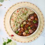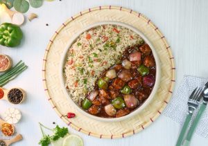 -Serve spicy Schezwan chicken gravy with fried rice!
