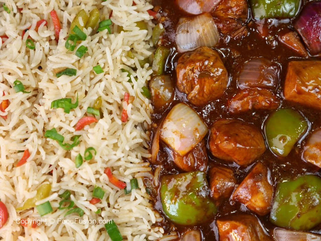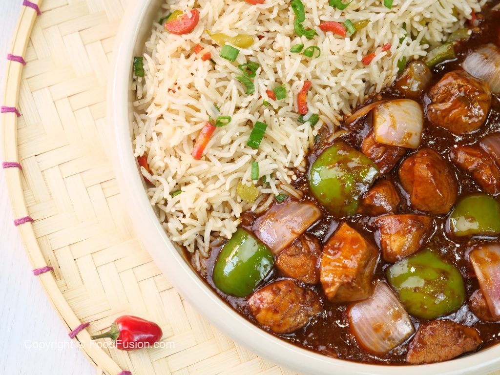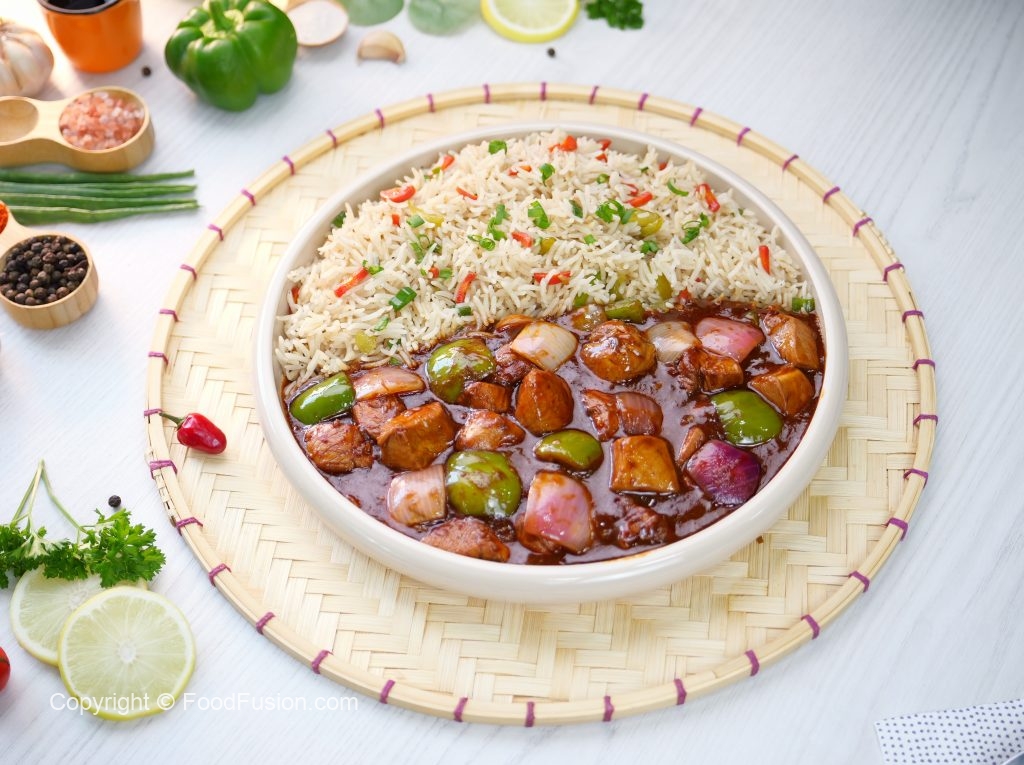 -Spicy Schezwan chicken gravy ko fried rice ka saath serve karein.