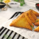 -First, dip samosa in whisked eggs, then coat evenly in bread crumbs.
