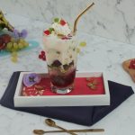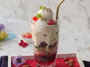 -In a serving glass,add soaked basil seeds,lal sharbat,prepared falooda sawaiyan,mixed nuts,green jelly,red jelly,apple,banana,grapes,pineapple,prepared rabri,vanilla ice-cream,garnish with mixed nuts,,tutti frutti & serve!