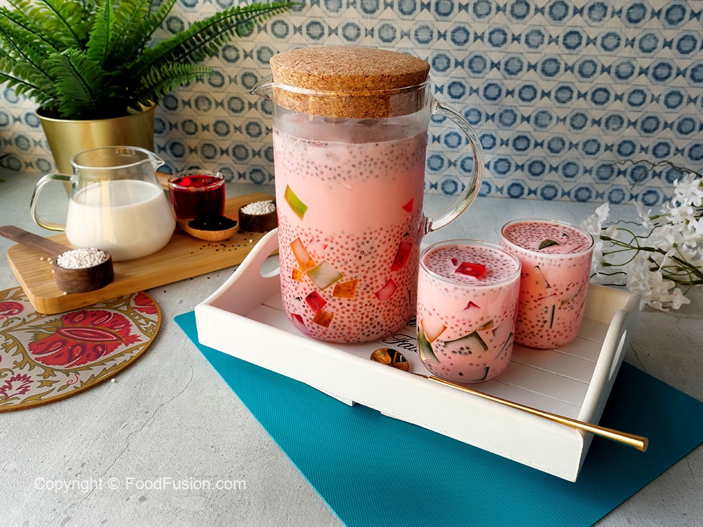 Jug mein ice cubes,colored jelly cubes,cooked sabudana,soaked tukhme balanga & tayyar doodh dal ker ache tarhan mix ker lein & serve karein!