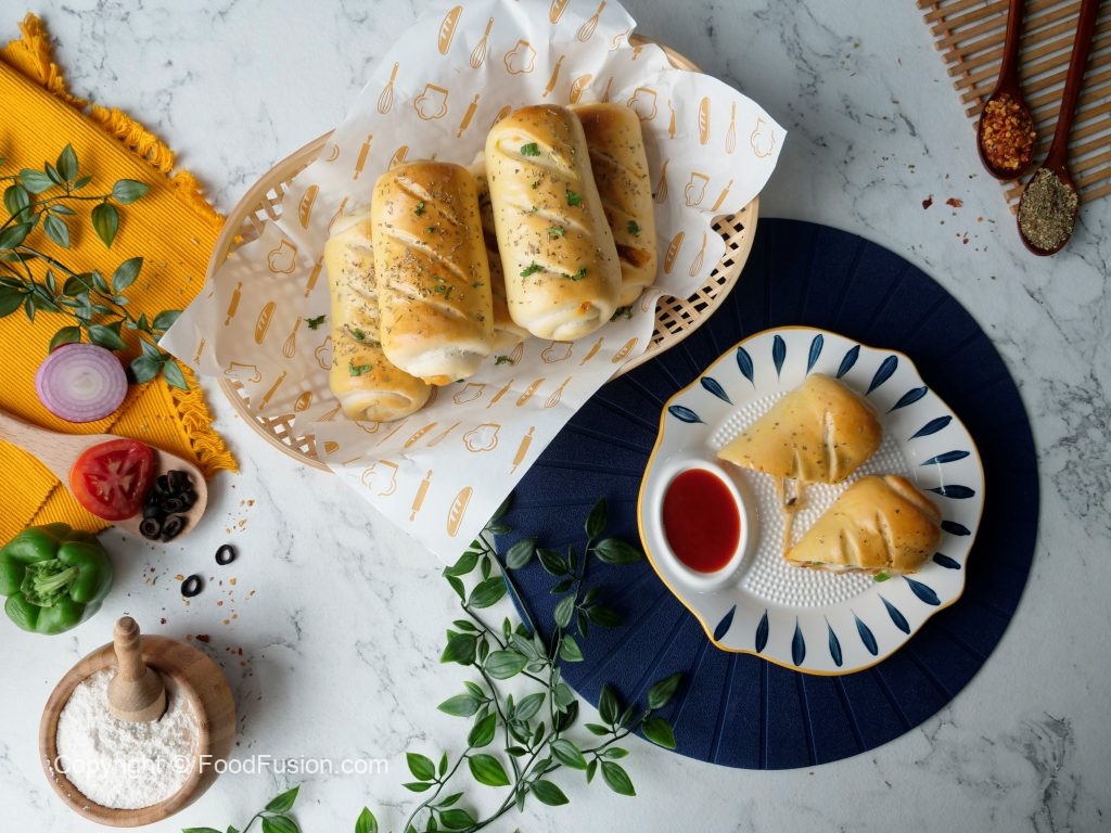 Rolled dough ki edges per pani laga lein aur dough ki sides ko fold ker ka dough ko roll ker lein aur cuts laga lein.