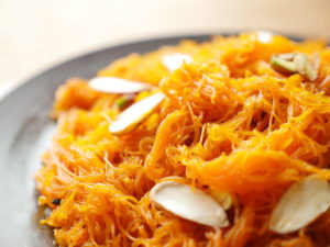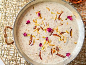 In a traditional serving bowl, add puff biscuits, fresh cream, prepared Kashmiri tea and garnish it with almonds and pistachios.