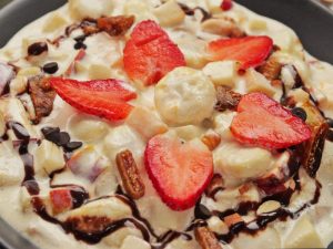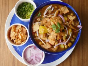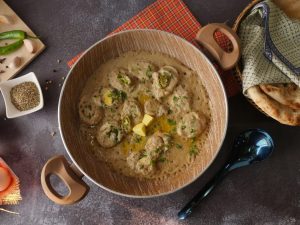 -Traditional serving bowl mein puff biscuits dalein, fresh cream dalein, tayar Kashmiri chai dalein aur almonds aur pistachios se garnish karen.
